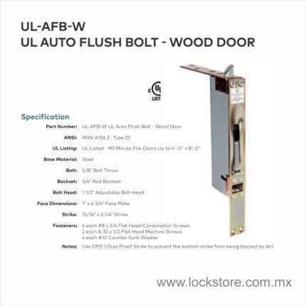 Especificaciones del Producto: UL-MFB-M – Manual Flush Bolt para Puertas Metálicas